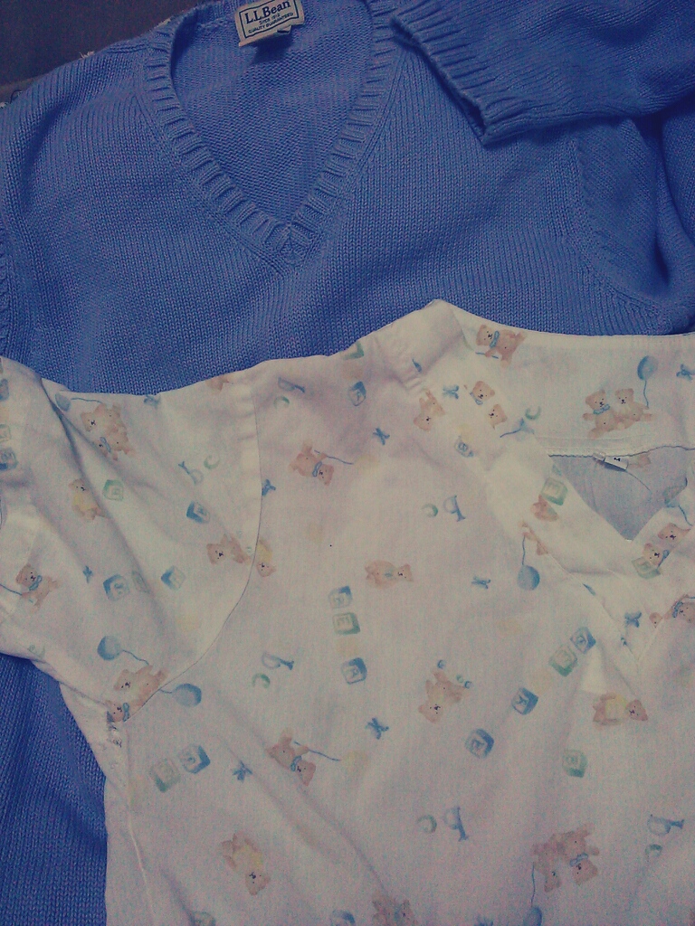 紫のニットとクマのホスピタルシャツ